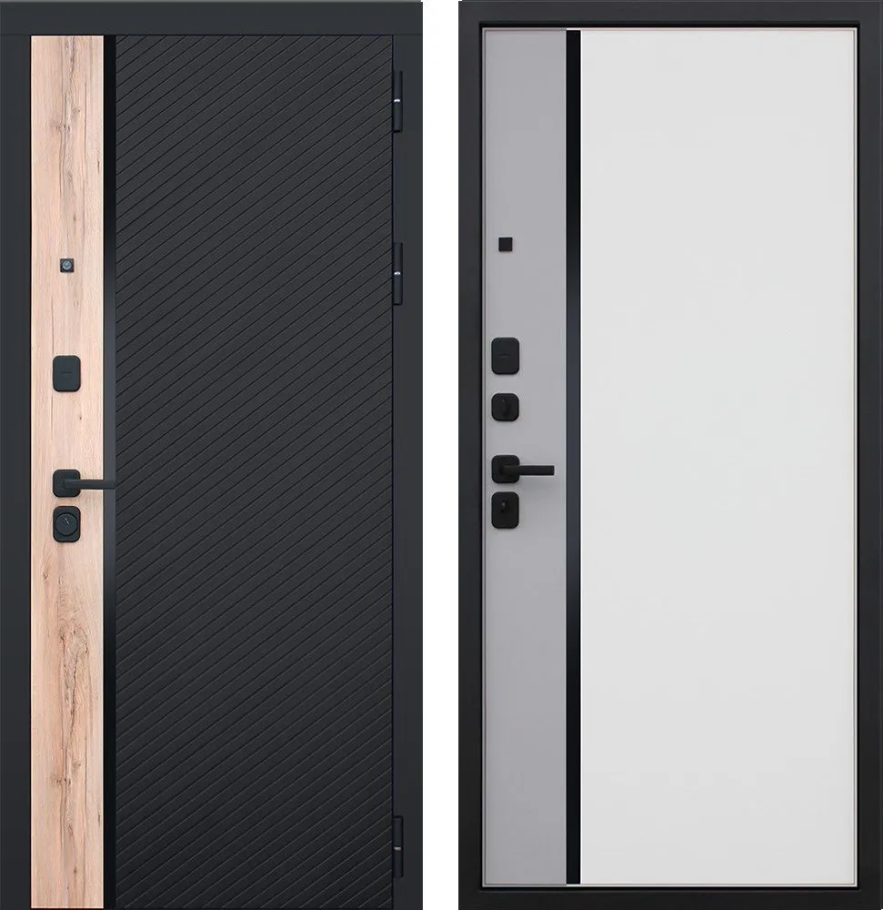 Порошковое покрытие “муар черный” Панель МДФ 10 мм. Объемная фрезеровка. Цветовая комбинация: “дуб галиф натур”, “шагрень черная”. Декоративная пластиковая вставка, цвет "черный". Наличник МДФ 80 мм., цвет “черный кварц”.