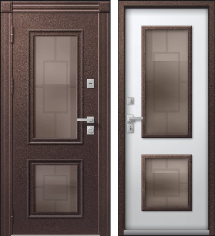 В конструкции двери Т-1 PREMIUM используется двухкамерный стеклопакет толщиной 48 мм, цвет Бронза с низкоэмиссионным энергосберегающим покрытием, сохраняющим тепло внутри дома. С внешней части стеклопакета установлена декоративная металлическая решетка. Эта дверь станет украшением Вашего дома